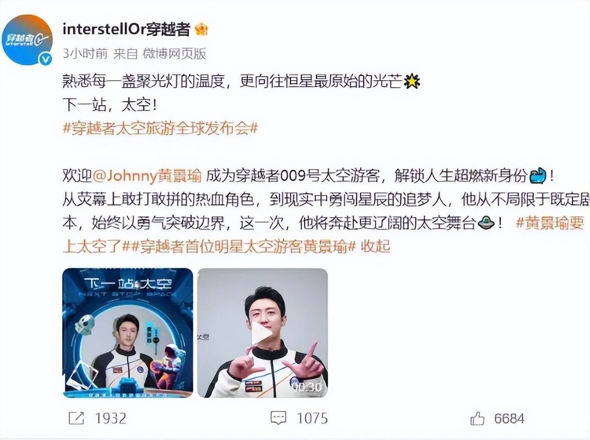 而如今宣布即将登上太空的黄景瑜,足以让整个内娱男明星沉默。